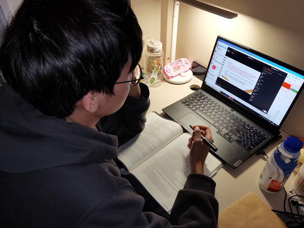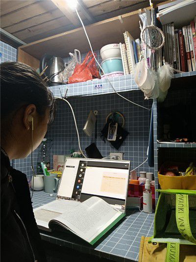 同学们在宿舍内认真听课。
