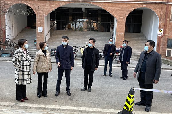 2月26日上午,江夏区委副书记柳新(左三)率队到校检查疫情防控工作。