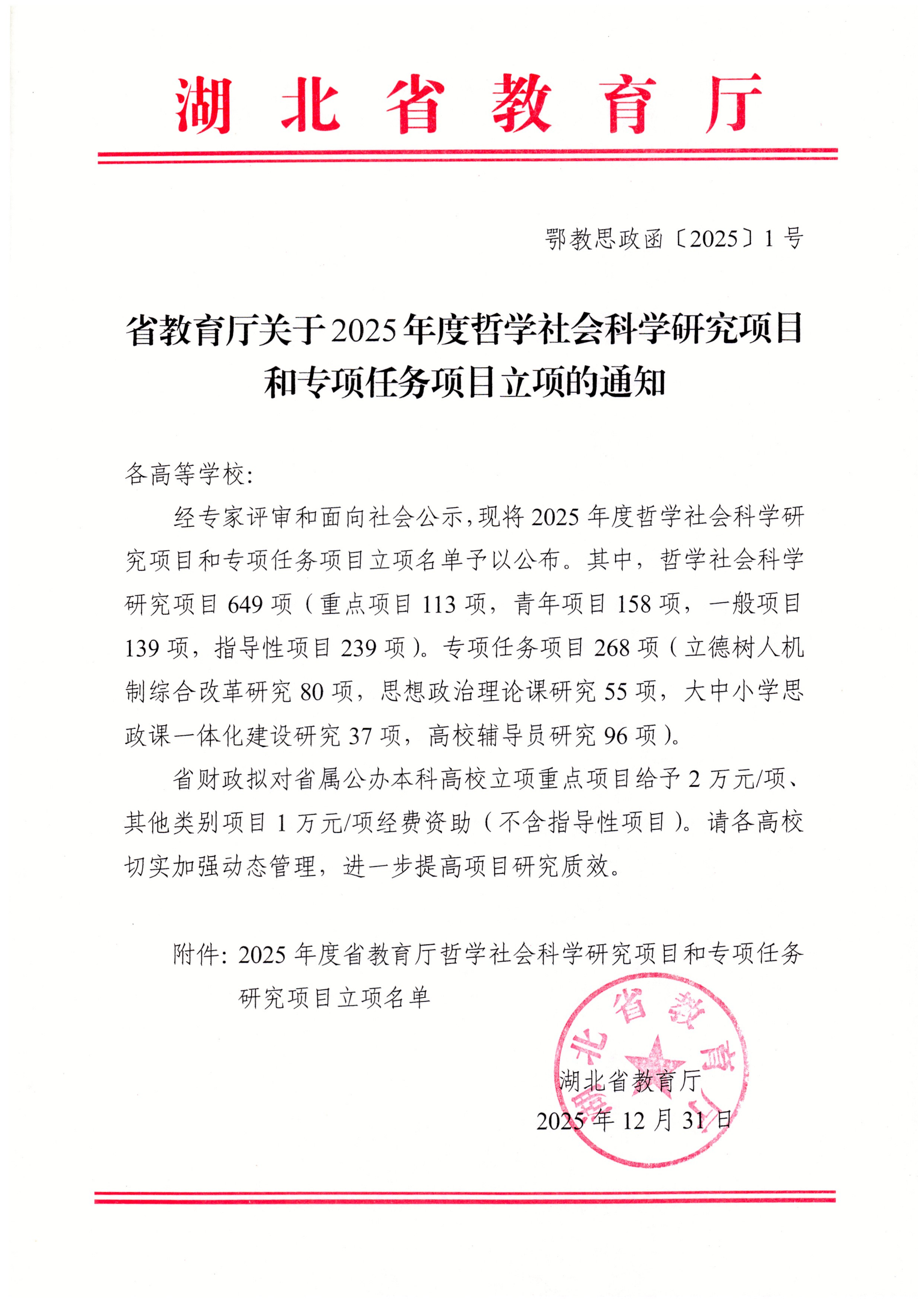 本网讯(通讯员 陈文敬)近日,湖北省教育厅公布了2025年度哲学社会科学研究项目和专项任务项目立项名单,pp电子共有7项课题获批立项,其中指导性项目6项、思想政治理论课研究项目1项。