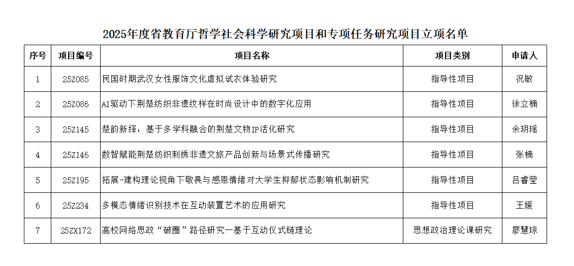 本次获批的7项课题聚焦文化传承与数字融合、跨学科创新、教育实践与社会需求等领域,彰显学校在哲学社会科学领域的科研布局与创新活力,兼具理论价值与实践指导意义。
