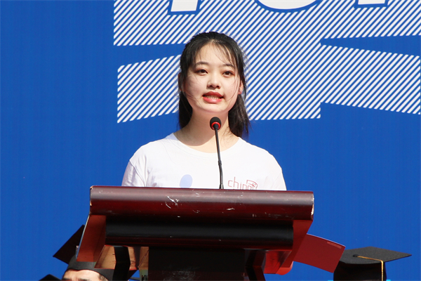 商学院2019级国际经济与贸易专业谢依婷同学代表全体在校生向学长学姐们致以最真诚的感谢,感谢学长学姐一直以来给予她们的无限关爱和帮助。“你们的宽容与关爱消除了我们初入校园的忐忑不安;你们的踏实沉稳褪去了我们的浮躁肤浅;你们的志存高远坚定了我们不懈努力的勇气与自信。”她表示,在今后的日子里,同学们定向学长学姐们看齐,踔厉奋发、建功时代。最后,她祝愿2022届全体毕业生们“一帆风顺,前程似锦!”