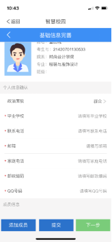 4. 点击信息核对,核对并完善个人信息,填写毕业学校、联系电话、邮箱、家庭电话等信息,完成信息填报后点击提交然后点下一步。