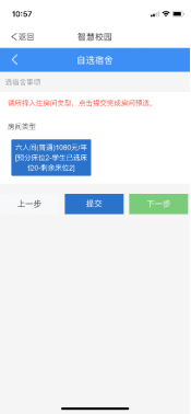 5.自选宿舍,进行宿舍类型的选择,选择需要的房间类型后点击提交,然后点击在线缴费,宿舍缴费需6小时内完成。如未完成,所选宿舍类型将自动收回。