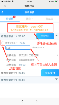 7.仔细核对自己的姓名、专业,勾选要缴费的项目,点击“立即支付”。