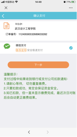 9.显示微信或支付宝支付,点击“下一步”进行支付,可选择微信零钱、或绑定的各大银行储蓄卡、信用卡完成支付。