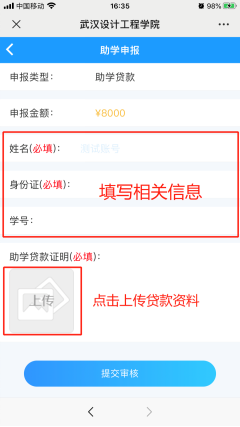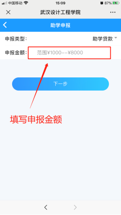 (2)输入“申报金额”,点击“下一步”。填写相关信息,并把所有助贷资料拍照上传后点击“提交审核”即可完成缓交申报。