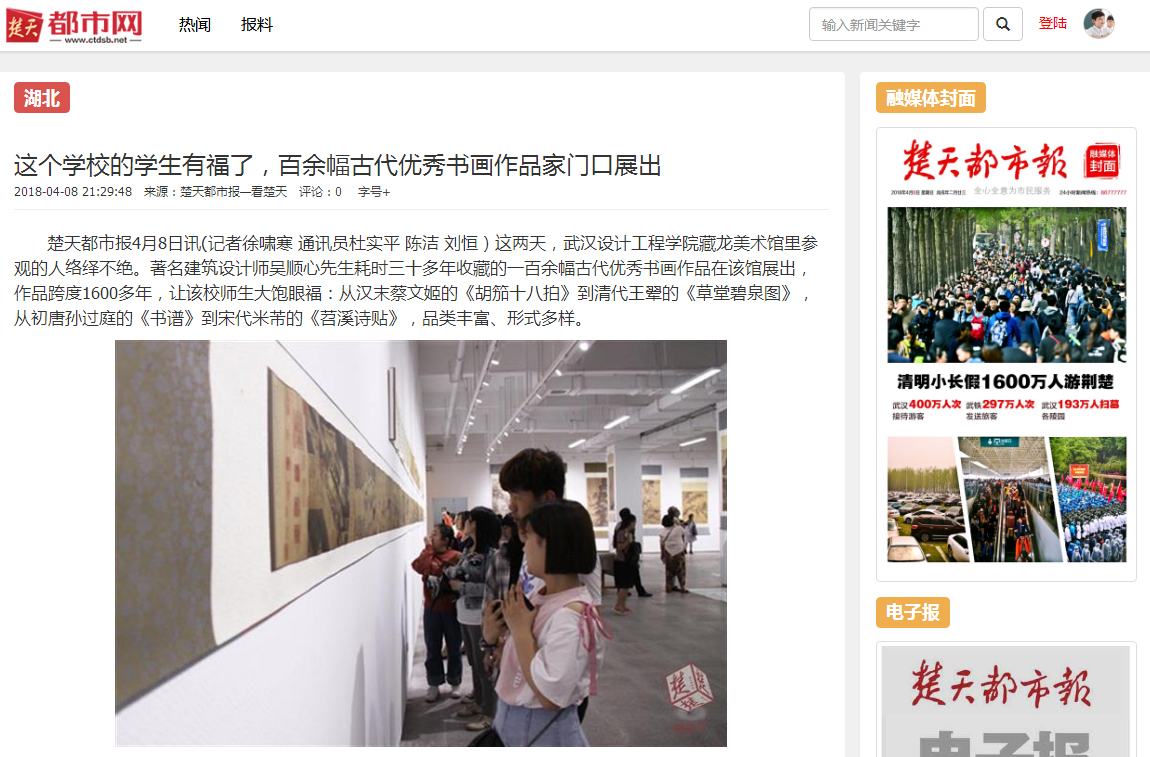 楚天都市报4月8日讯(记者徐啸寒 通讯员杜实平 陈洁 刘恒)这两天,pp电子官方网站藏龙美术馆里参观的人络绎不绝。著名建筑设计师吴顺心先生耗时三十多年收藏的一百余幅古代优秀书画作品在该馆展出,作品跨度1600多年,让该校师生大饱眼福:从汉末蔡文姬的《胡笳十八拍》到清代王翚的《草堂碧泉图》,从初唐孙过庭的《书谱》到宋代米芾的《苕溪诗贴》,品类丰富、形式多样。