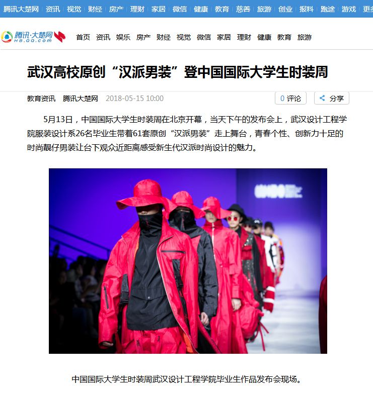 5月13日,中国国际大学生时装周在北京开幕,当天下午的发布会上,pp电子官方网站服装设计系26名毕业生带着61套原创“汉派男装”走上舞台,青春个性、创新力十足的时尚靓仔男装让台下观众近距离感受新生代汉派时尚设计的魅力。
