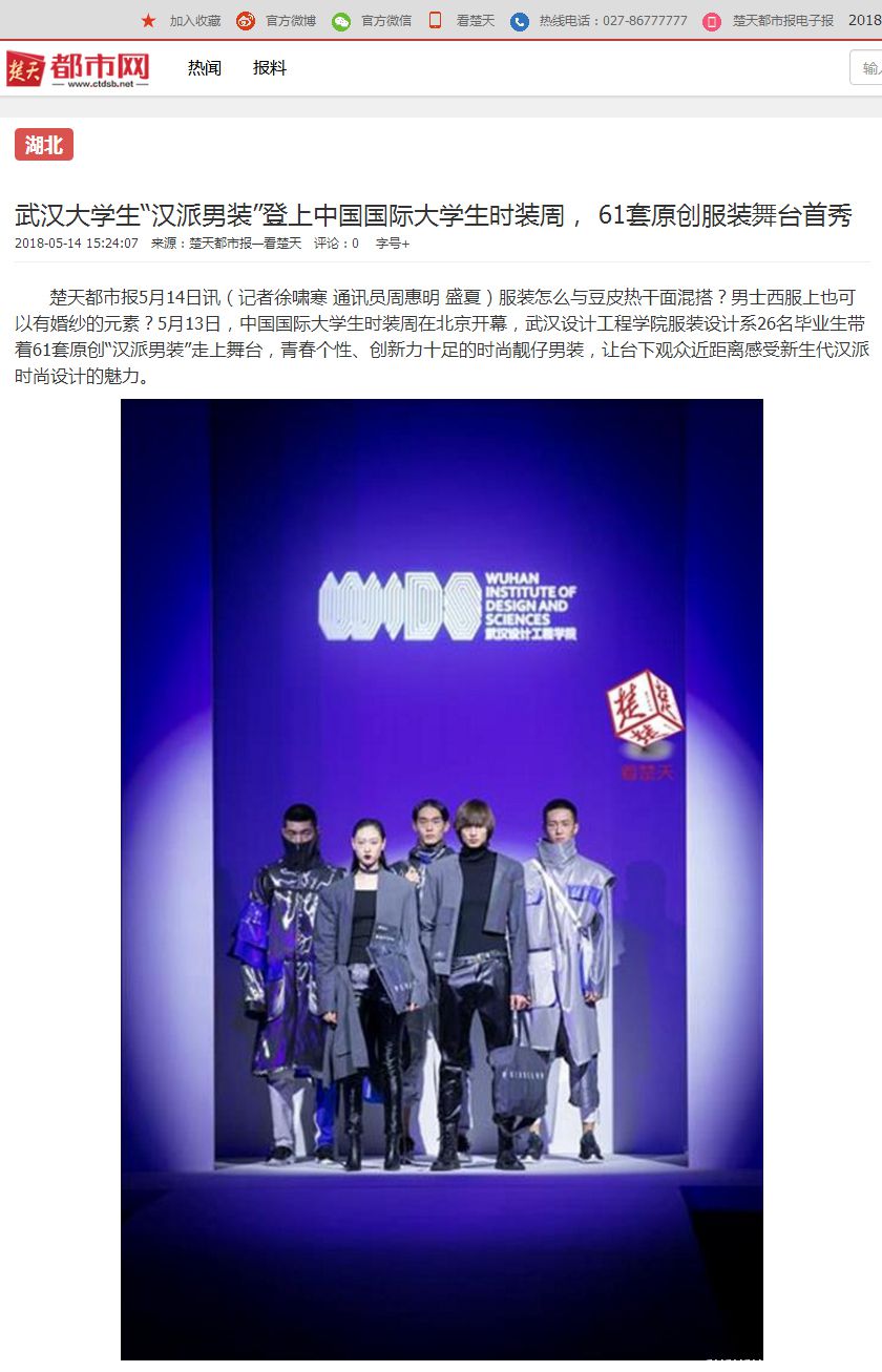 楚天都市报5月14日讯(记者徐啸寒 通讯员周惠明 盛夏)服装怎么与豆皮热干面混搭?男士西服上也可以有婚纱的元素?5月13日,中国国际大学生时装周在北京开幕,pp电子官方网站服装设计系26名毕业生带着61套原创“汉派男装”走上舞台,青春个性、创新力十足的时尚靓仔男装,让台下观众近距离感受新生代汉派时尚设计的魅力。