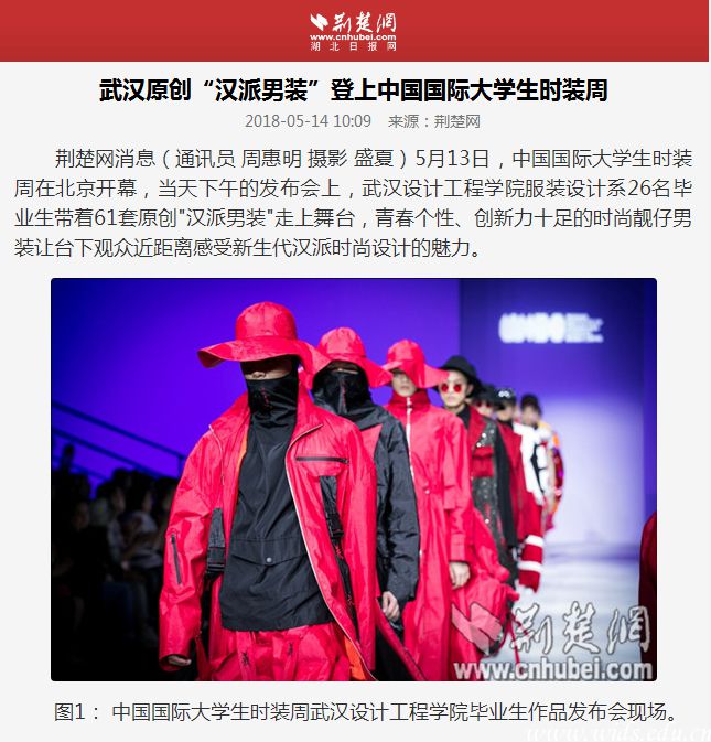 荆楚网消息(通讯员 周惠明 摄影 盛夏)5月13日,中国国际大学生时装周在北京开幕,当天下午的发布会上,pp电子官方网站服装设计系26名毕业生带着61套原创"汉派男装"走上舞台,青春个性、创新力十足的时尚靓仔男装让台下观众近距离感受新生代汉派时尚设计的魅力。