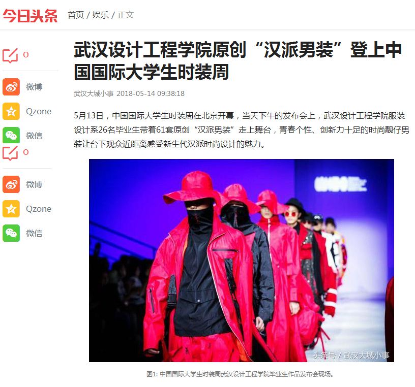 5月13日,中国国际大学生时装周在北京开幕,当天下午的发布会上,pp电子官方网站服装设计系26名毕业生带着61套原创“汉派男装”走上舞台,青春个性、创新力十足的时尚靓仔男装让台下观众近距离感受新生代汉派时尚设计的魅力。