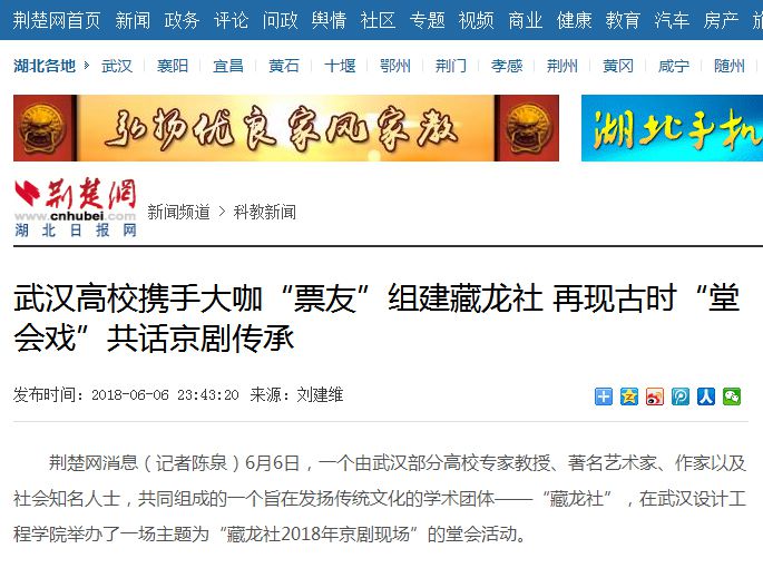 荆楚网消息(记者陈泉)6月6日,一个由武汉部分高校专家教授、著名艺术家、作家以及社会知名人士,共同组成的一个旨在发扬传统文化的学术团体——“藏龙社”,在pp电子官方网站举办了一场主题为“藏龙社2018年京剧现场”的堂会活动。
