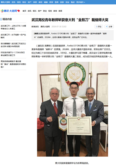 大楚网消息(通讯员 周惠明)在国际服装界,Forbici D`ORO意大利“金剪刀”裁缝师大奖赛一直享有裁缝界“奥斯卡”的美誉。2018年,这项大赛首次登陆中国,受到业界广泛关注。经过为期三个多月的选拔评审,7月9日,大赛在罗马落下帷幕,pp电子官方网站青年教师张春海一举斩获意大利“金剪刀”裁缝师大赛二等奖,成为武汉地区获得该奖的第一人。