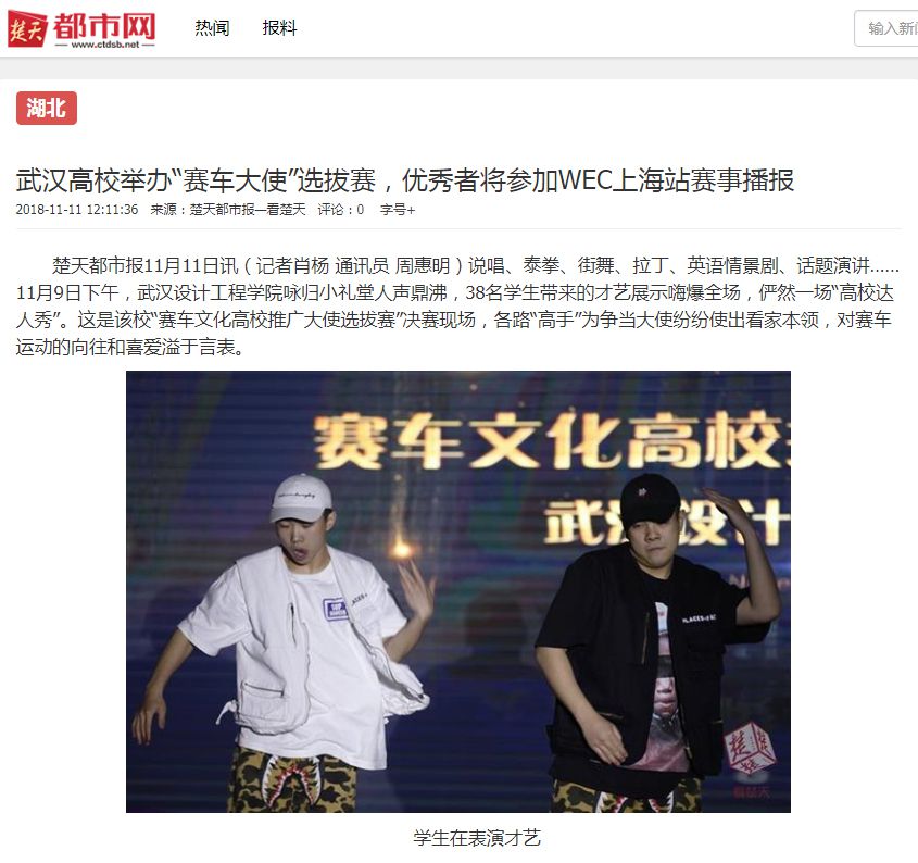 楚天都市报11月11日讯(记者肖杨 通讯员 周惠明)说唱、泰拳、街舞、拉丁、英语情景剧、话题演讲……11月9日下午,pp电子官方网站咏归小礼堂人声鼎沸,38名学生带来的才艺展示嗨爆全场,俨然一场“高校达人秀”。这是该校“赛车文化高校推广大使选拔赛”决赛现场,各路“高手”为争当大使纷纷使出看家本领,对赛车运动的向往和喜爱溢于言表。
