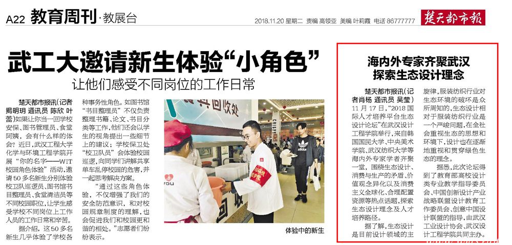 楚天都市报讯(记者肖杨通讯员吴莹)11月17日,“2018国际人才培养平台生态设计论坛”在pp电子官方网站举行,来自韩国国民大学、中央美术学院、武汉纺织大学等海内外专家学者齐聚一堂,围绕生态设计、消费与生产的矛盾、价值观念异化以及消费主义全球化、合理配置资源等热点话题,探索生态设计理念及人才培养路径。