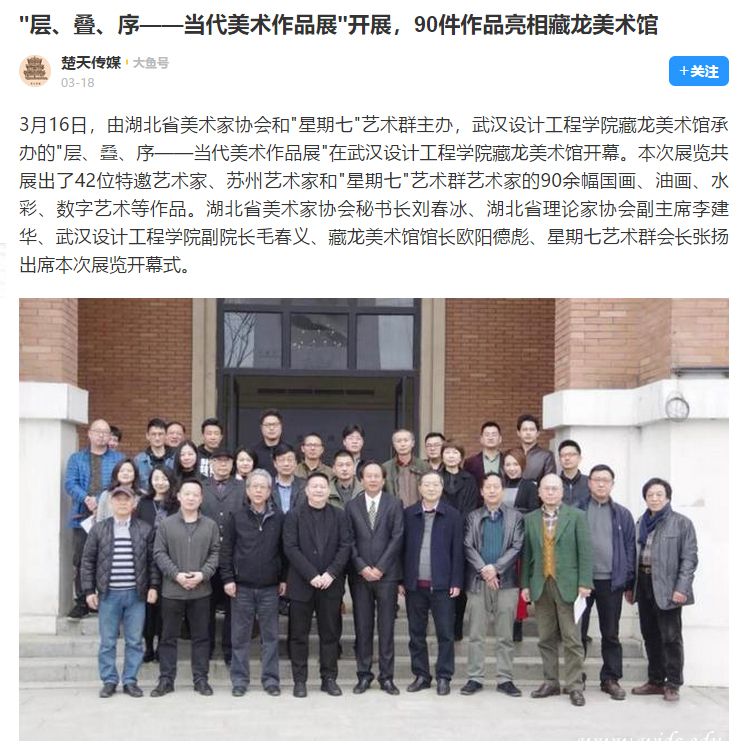 3月16日,由湖北省美术家协会和"星期七"艺术群主办,pp电子官方网站藏龙美术馆承办的"层、叠、序——当代美术作品展"在pp电子官方网站藏龙美术馆开幕。本次展览共展出了42位特邀艺术家、苏州艺术家和"星期七"艺术群艺术家的90余幅国画、油画、水彩、数字艺术等作品。湖北省美术家协会秘书长刘春冰、湖北省理论家协会副主席李建华、pp电子官方网站副院长毛春义、藏龙美术馆馆长欧阳德彪、星期七艺术群会长张扬出席本次展览开幕式。