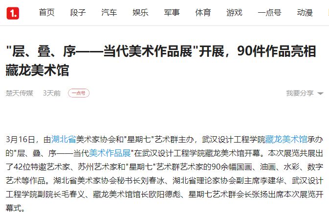 3月16日,由湖北省美术家协会和"星期七"艺术群主办,pp电子官方网站藏龙美术馆承办的"层、叠、序——当代美术作品展"在pp电子官方网站藏龙美术馆开幕。本次展览共展出了42位特邀艺术家、苏州艺术家和"星期七"艺术群艺术家的90余幅国画、油画、水彩、数字艺术等作品。湖北省美术家协会秘书长刘春冰、湖北省理论家协会副主席李建华、pp电子官方网站副院长毛春义、藏龙美术馆馆长欧阳德彪、星期七艺术群会长张扬出席本次展览开幕式。