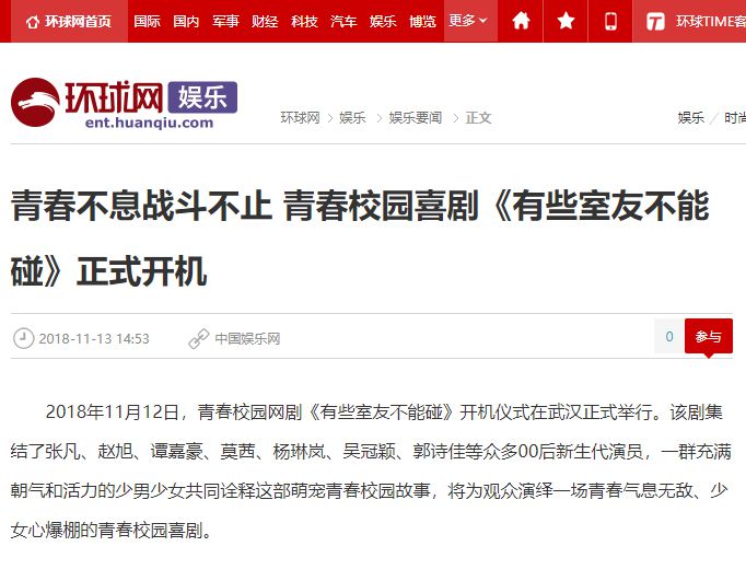 2018年11月12日,青春校园网剧《有些室友不能碰》开机仪式在武汉正式举行。该剧集结了张凡、赵旭、谭嘉豪、莫茜、杨琳岚、吴冠颖、郭诗佳等众多00后新生代演员,一群充满朝气和活力的少男少女共同诠释这部萌宠青春校园故事,将为观众演绎一场青春气息无敌、少女心爆棚的青春校园喜剧。