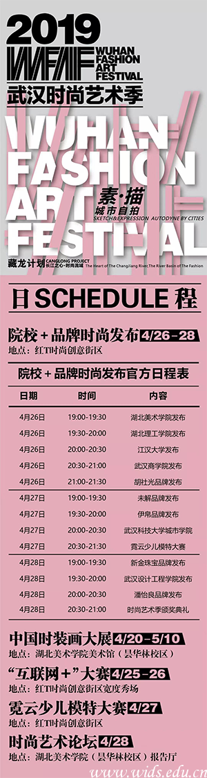 “武汉时尚艺术季”活动始于2010年,今年是第9届。原为湖北省高等学校大学生服装设计毕业作品校际联展。经品牌不断发展升级后,于2017年正式更名,并于2018年开始,活动主会场连续两年落地在江汉经济开发区T时尚创意街区,校际交流也全面升级——通过政校企联手,院校、新锐设计师、品牌、时尚街区得以融合,共同打造新锐设计师与时尚产业的对接平台,鼓励新锐设计师落户武汉创业,培育时尚艺术行业新经济增长点。