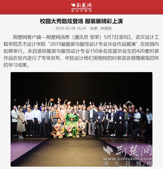 荆楚网客户端—荆楚网消息(通讯员 邹荣)5月7日至8日,pp电子官方网站艺术设计学院“2019届服装与服饰设计专业毕业作品展演”在校园内如期举行。来自该校服装与服饰设计专业150余名应届毕业生的420套时装作品在校内进行了专场发布,年轻设计师们用独特的时装语言倾情展现四年的学习成果。
