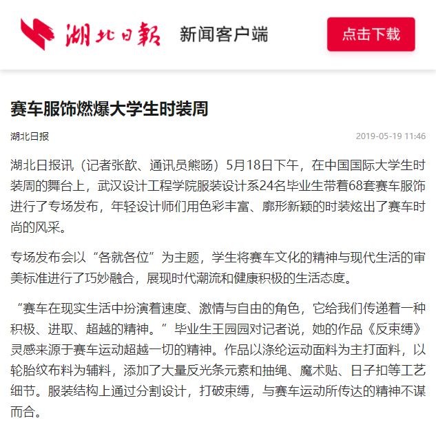 湖北日报讯(记者张歆、通讯员熊旸)5月18日下午,在中国国际大学生时装周的舞台上,pp电子官方网站服装设计系24名毕业生带着68套赛车服饰进行了专场发布,年轻设计师们用色彩丰富、廓形新颖的时装炫出了赛车时尚的风采。