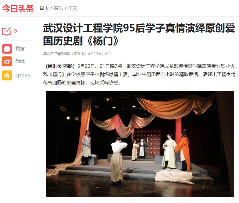 据介绍,《杨门》是该校表演系老师李英男的原创剧目,选材于北宋时期骁勇善战的杨家将的故事。剧情围绕大宋朝廷上“战”与“和”的争辩而展开,曾是主和派的前任宰相王辉,此时却上书宋仁宗,支持主战。大为困惑的宋仁宗急召王辉至殿前,希望弄明白其中缘由。二人各怀心意地交谈之时,不由回忆起四年前杨门出征的场景……整场戏下来,28名毕业生用极具古典韵味的表演,将杨家名将前仆后继、忠心报国的英雄事迹演绎得淋漓尽致。