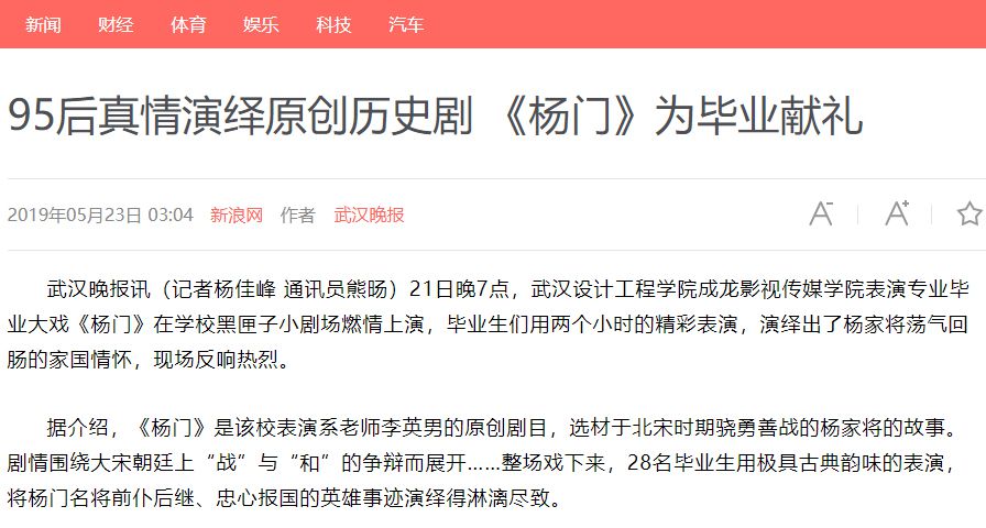 据介绍,《杨门》是该校表演系老师李英男的原创剧目,选材于北宋时期骁勇善战的杨家将的故事。剧情围绕大宋朝廷上“战”与“和”的争辩而展开……整场戏下来,28名毕业生用极具古典韵味的表演,将杨门名将前仆后继、忠心报国的英雄事迹演绎得淋漓尽致。