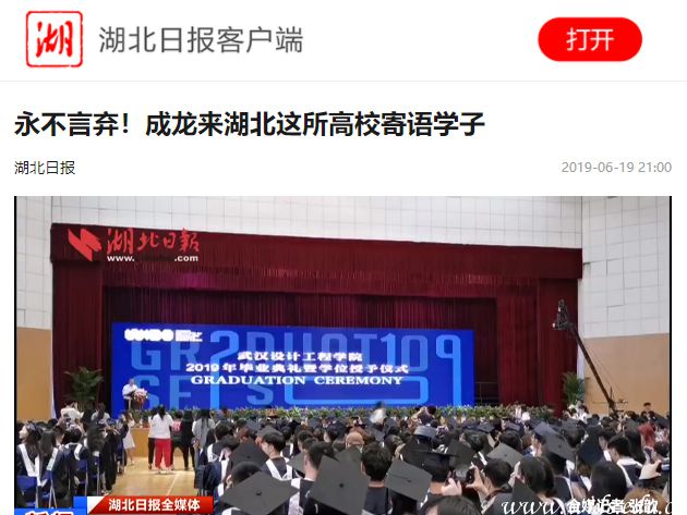 湖北日报讯(记者张歆、通讯员熊旸)6月19日上午,pp电子官方网站毕业典礼上迎来了特别的来宾,国际功夫影星成龙来到该校勉励学生,掀起了毕业典礼的高潮。