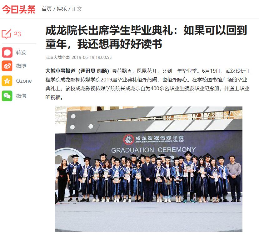 “坦白说,我在这里学历最低,今天我以院长的身份给大家讲话,还是有点惭愧。”成龙向成龙影视传媒学院全体毕业生致辞,他谦虚地说:“年轻时,我拿了很多奖、也赚了很多钱,但到了今天,如果可以回到童年,我还想再好好读书,这是这么多年来唯一遗憾的事情。”成龙勉励在场学子,毕业之后无论是继续进修还是步入各行各业,都要把握机会继续学习。