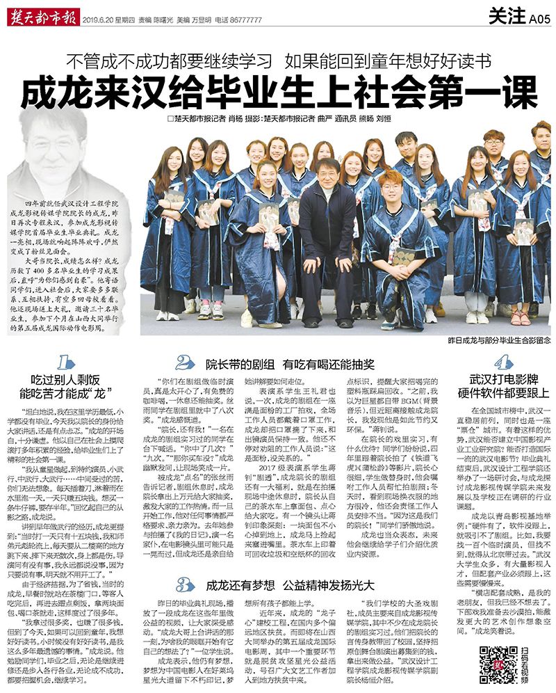 由于经济拮据,为了省钱,当时的成龙,早餐时就站在茶楼门口,等客人吃完后,再进去蹭点剩饭,拿两块面包、喝口茶就走,这样度过了很多年。“我拿过很多奖,也赚了很多钱,但到了今天,如果可以回到童年,我想好好读书。小时候没有好好读书,是我这么多年最遗憾的事情。”成龙说。他勉励同学们,毕业之后,无论是继续进修还是步入各行各业,无论成不成功,都要把握机会,继续学习。