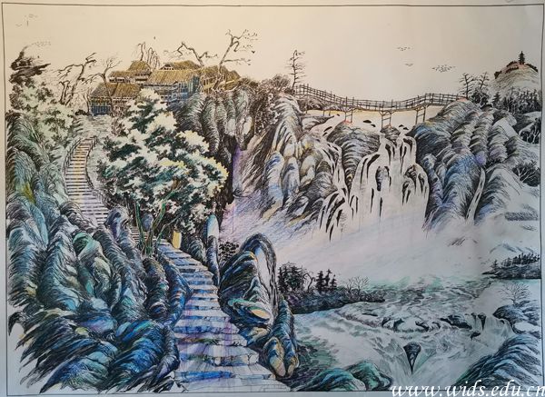 “平时会留意生活中的细节,毕竟艺术源于生活而高于生活嘛, 小寒时节,校园里的银杏叶子还没有掉完,我就以‘武设小寒’为主题,以银杏叶和朱红窗格为元素做了一面墙绘,还参加了墙绘比赛。”