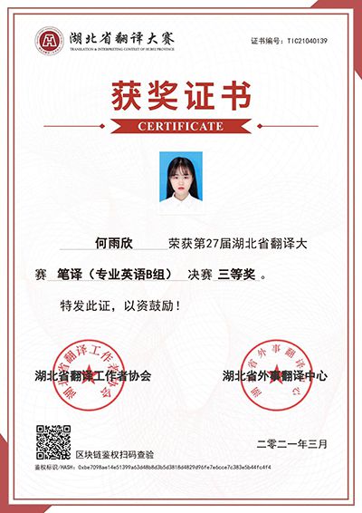 何雨欣参加第27届湖北省翻译大赛获三等奖。
