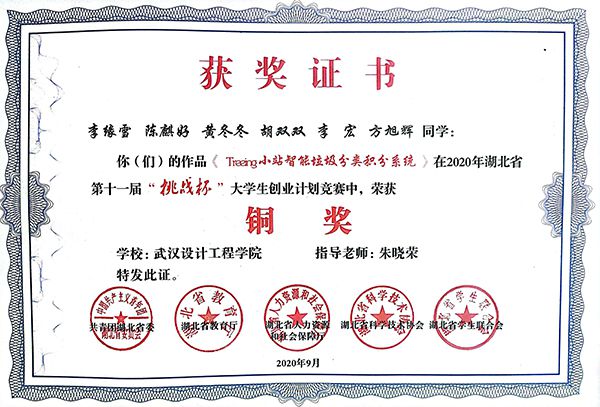 《Treeing小站智能垃圾分类积分系统》项目荣获第十一届“挑战杯”大学生创业计划竞赛铜奖。