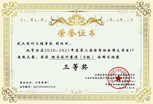 胡双双荣获第三届传智杯全国大学生IT技能大赛程序设计赛道三等奖。