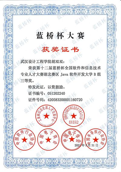 胡双双荣获第十二届蓝桥杯全国软件和信息技术专业人才大赛JAVA三等奖。