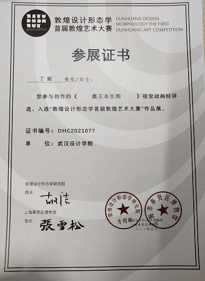 2021年 “敦煌设计形态学首届敦煌艺术大赛”,丁妮说老师挑中她参与备赛时,自己正好在准备教师资格证考试,同时作为戏剧影视美术设计2004班班级助理,她还要做好班级相关工作。“本来准备比赛就挺忙的,结果由于疫情的暴发,工作变得更加困难了。”去不了工作室,就和老师在线上一点一点沟通;任务太多忙不过来,就在宿舍熬夜作图、准备资料。功夫不负有心人,在全组的努力下,他们的作品《鹿王本生图》成功入选“敦煌设计形态学首届敦煌艺术大赛”作品展。“虽然这个专业挺辛苦的,但是我真的非常喜欢。”