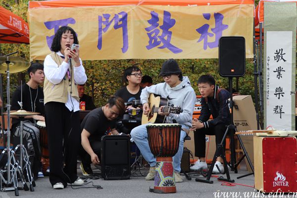 西门鼓社的社员们倾情表演各类打击乐与架子鼓合奏,动感的节奏、婉转悠扬的歌声吸引了不少“萌新”驻足观看。邹昱媛 摄