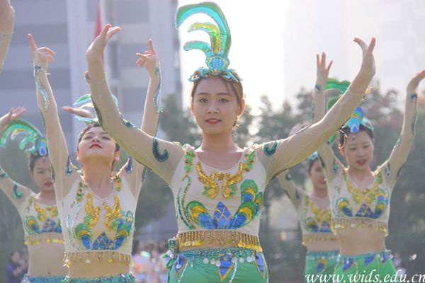 校舞蹈队表演傣族舞,看,一只只灵动的孔雀用柔嫩的腰肢,灵活的手指,轻盈的双脚,舞出神秘的境界。